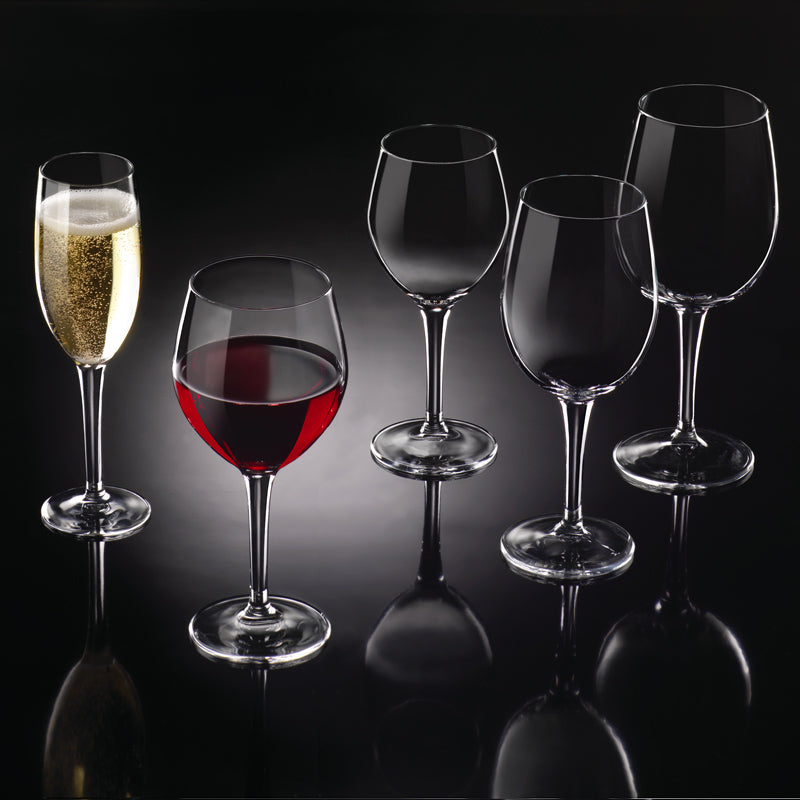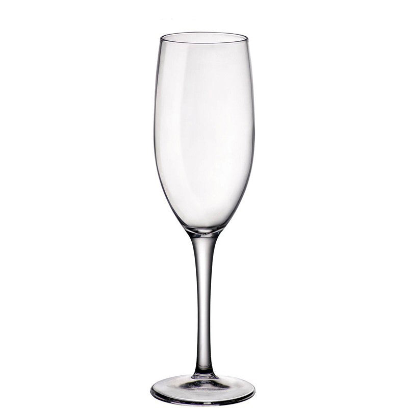 Calici flute in vetro temperato, grande resistenza e flessibilità d'uso, forma elegante e moderne, ideali nella ristorazione professionale e nel banqueting.