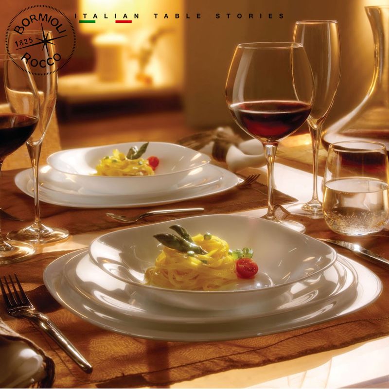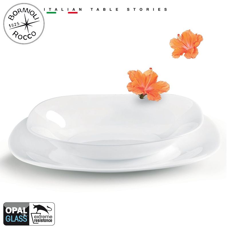 Servizio completo di piatti quadrati in vetro opale super resistente agli urti e ai graffi, bianco super splendente, massima garanzia di igienicità, pulizia e sicurezza alimentare, riciclabile al 100%, ideale per il microonde e lavabile in lavastoviglie.