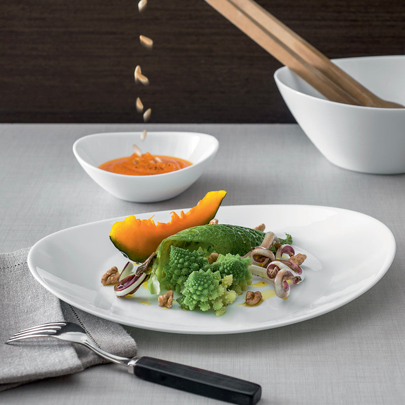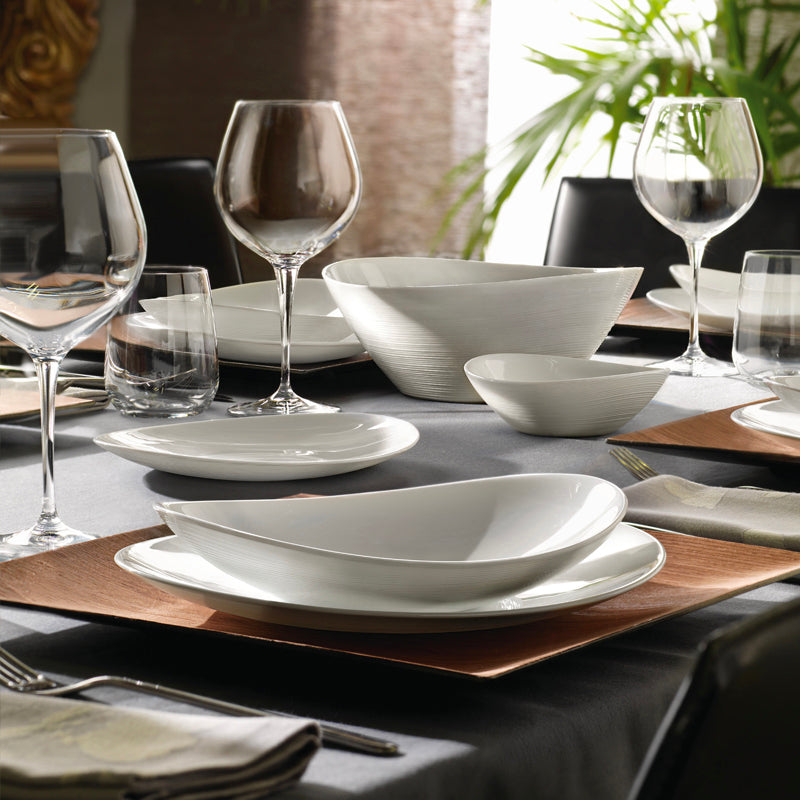 Service de table pour six personnes complet avec saladier en verre trempé, couleur blanche, forme ovale avec effet gaufré extérieur, très résistant, adapté au micro-ondes.