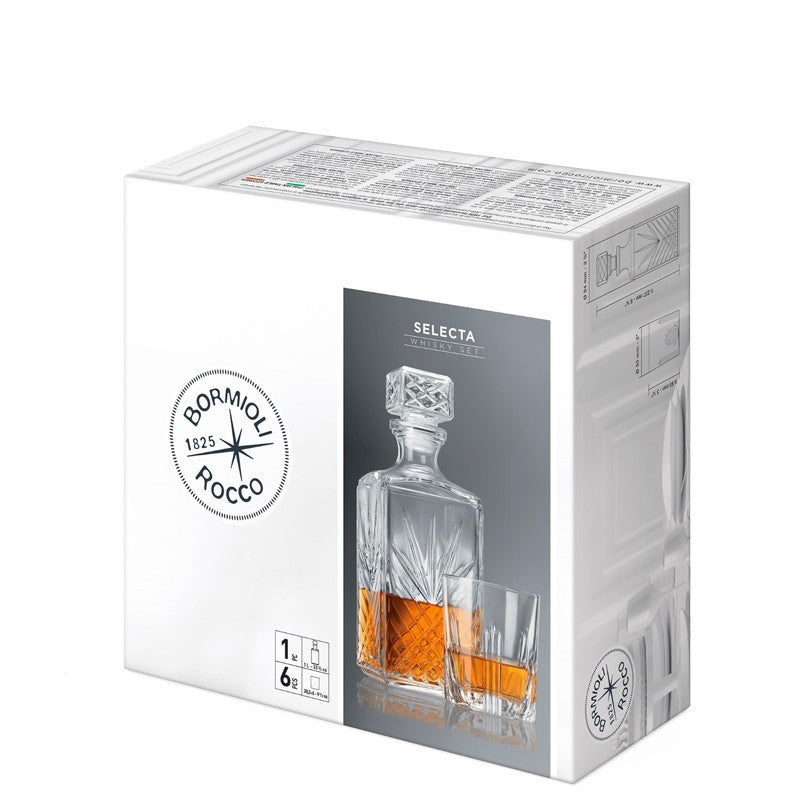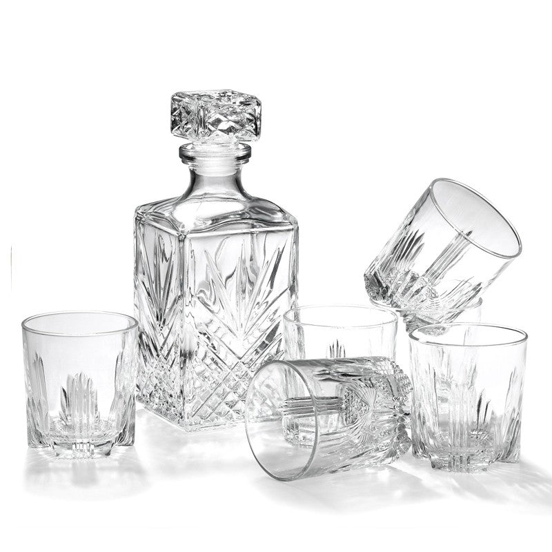 Service complet de carafe carrée avec bouchon et six verres à whisky, en verre transparent, économique, pratique, utile à posséder et à offrir.
