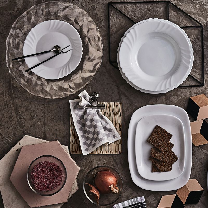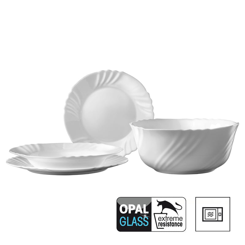 Service de table complet pour 6 personnes avec saladier en verre opale super résistant, design vintage, couleur blanche, adapté aux lave-vaisselle et aux fours à micro-ondes.