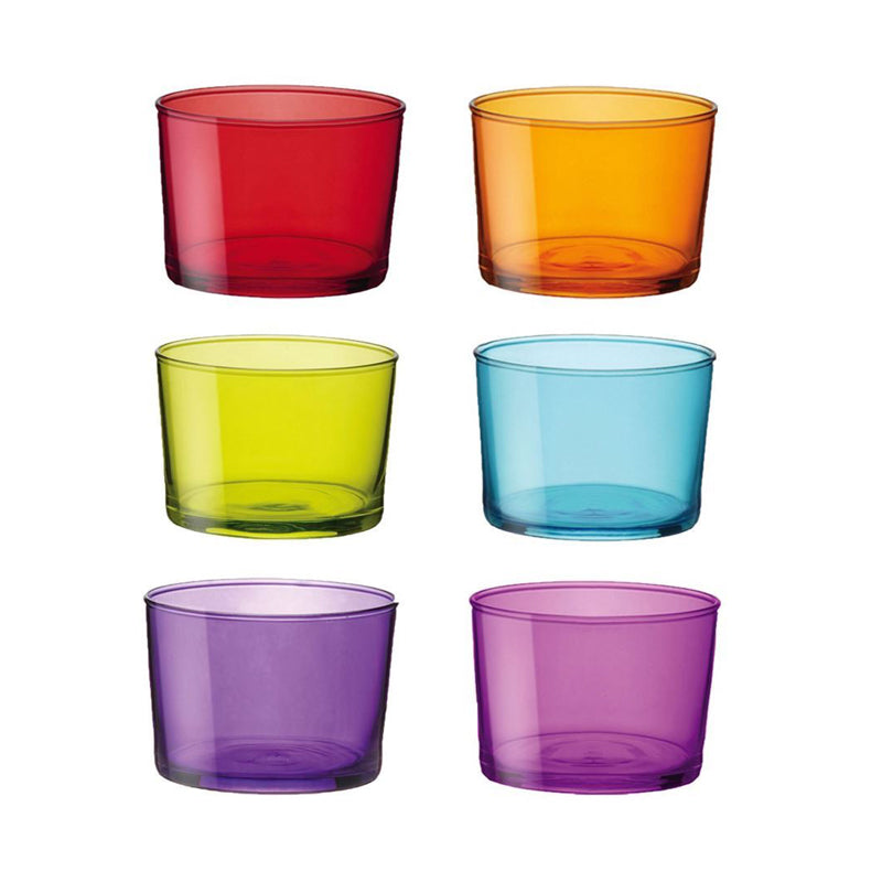 Bormioli Rocco Bodega Mini Multicolor: set di bicchieri in vetro temperato da 22,5 cl con colori vivaci (rosso, fucsia, viola, arancione, azzurro, verde). Ideali per amari, liquori, finger food e dolci. Eleganti, versatili e rispettosi dell’ambiente.