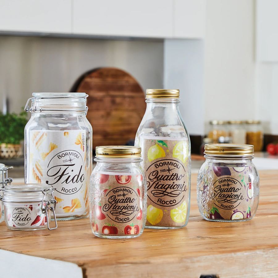 Vaso in vetro completo di capsula di chiusura salva-freschezza indicato principalmente per la conservazione di frutta e verdure, ma che può essere utilizzato anche per contenere oggetti, piantine e fiori, servire bevande e cocktails.